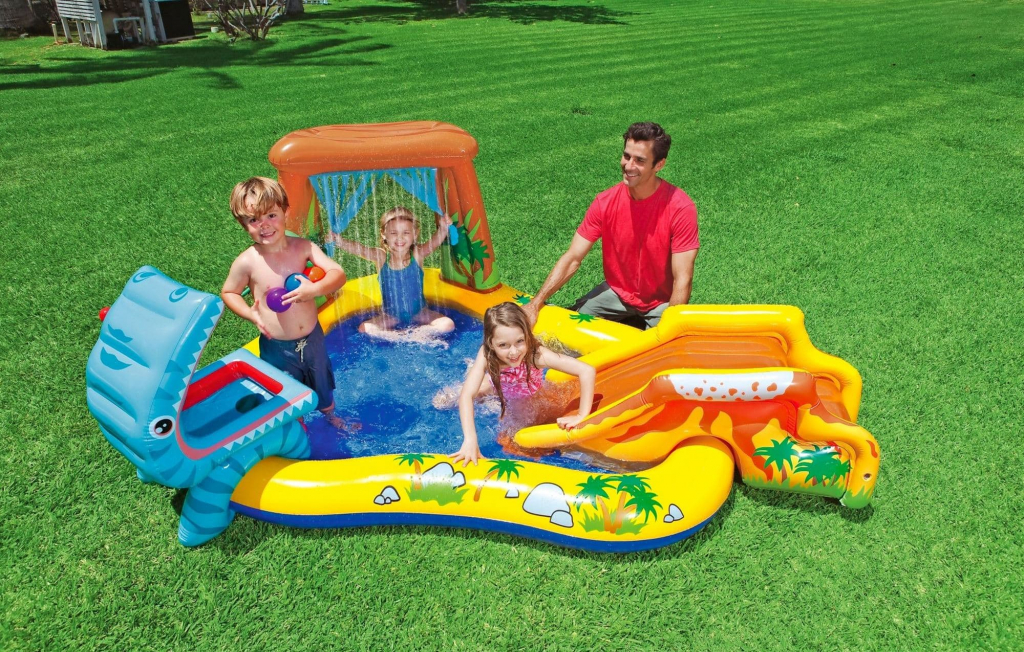 Если сесть под мини-вулкан, то можно очутиться под фонтаном, а накормить голодных динозавров можно 6 разноцветными шариками. Для этого надо попасть в раскрытую пасть зверя. Для того, чтобы наслаждаться и веселиться под брызгами, надо всего лишь подключить садовый шланг, для работы распылителя пальмы и работы водопада. На надувной горке можно спускаться прямо в воду. Этот игровой центр бассейн - семейный, и будет безопасным даже для маленьких детей.